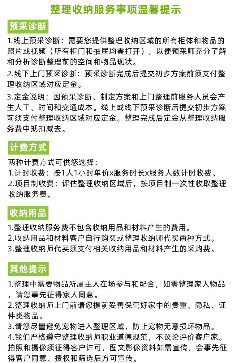 【服务范围】 衣橱/衣柜/衣帽间整理收纳 【计费方式】 1.计时收费:按1人1小时单价×服务时长×服务人数(不足一小时按实际时间结算); 2.项目制收费:预采完成后按项目制提供一次性整理收纳服务费用报价。 【服务流程】 一.整理开始前 1.预采诊断:预采师整理前提前上门了解人、物、收纳空间的现状。(包含:客户需求、生活动线、审美/收纳倾向、空间规划/改造、所需材料/收纳用品、物品状态等); 2.制定整理收纳服务方案:预采后整理师根据现状与需求提供定制化整理收纳方案。 二.整理过程中 1.上门整理:整理收纳师携带工具箱、收纳用品、改造材料等上门; 2.整理收纳流程:清空-分类-筛选(无筛选可跳过)-清洁(依据客户需求自由选择)-收纳-陈列(依据客户需求自由选择。 三.整理结束后 1.客户验收:主整理师或区域整理师陪同客户完成整理区域的巡视,告知物品位置; 2.整理报告:整理结束三天后可根据客户需要提供整理收纳报告书。 【专业服务与工具】 1.专业培训:每一位整理收纳师均接受过六天职业课程理论+实操培训; 2.健康体检:每一位整理收纳师均通过三甲医院健康体检; 3.隐私保护:严格遵守整理收纳师职业道德,保护客户隐私; 4.售后保障:提供整理后七日内免费优化服务,两次整理收纳师线上一小时指导服务; 5.专业工具:入户、清洁、改造、工作等工具齐全。 【温馨提示】 1.因整理收纳服务需要预采诊断,如时间充裕,请尽量提前安排预采师上门或线上了解现状; 2.所有收纳用品、改造材料、置物家具均可自行购买或整理收纳师代买; 3.请在整理收纳师上门前提前保管好贵重、隐私、证件类物品; 4.请尽量避免宠物进入整理区域,防止宠物无意损坏物品; 5.整理中需要物品主人在场配合,如需整理家人物品需事先征得家人许可; 6.我们严格遵守整理收纳职业道德规范,不评论不议论客户家,影音图文等资料需事先征得客户许可方可分享和宣传。